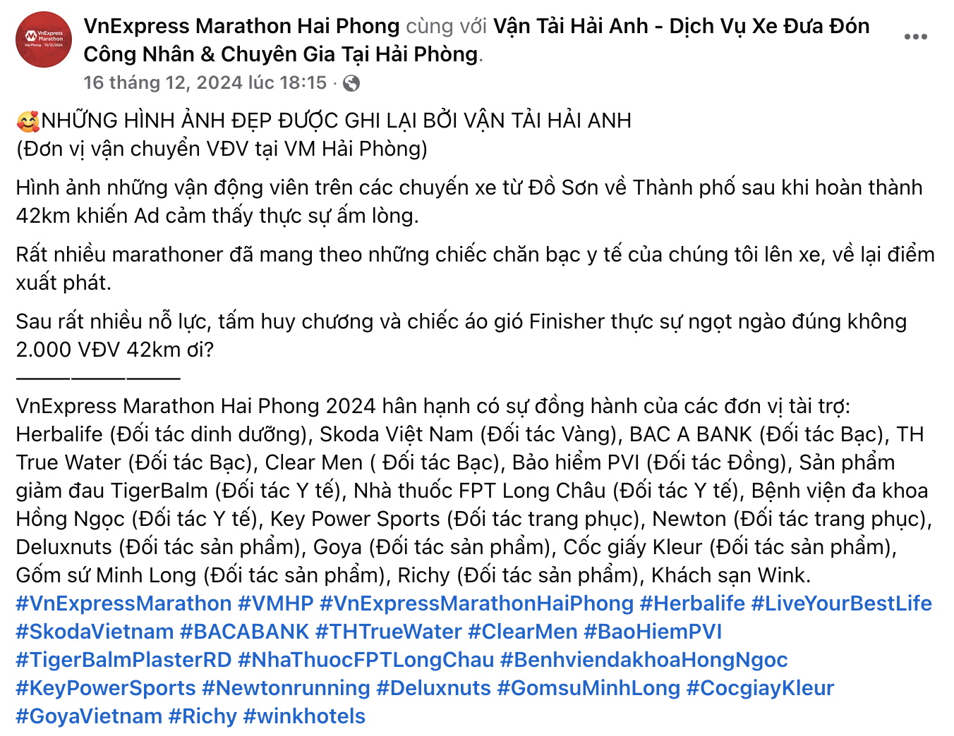 Thân chào anh chị em Runner, VnExprss Marathon Hải Phòng 2023 đã thành công và thật ấn tượng với sự tham gia của hơn 10.000 vđv trên khắp Việt Nam đến Hải Phòng tham dự. VnExprss Marathon Hải Phòng 2023- Vận tải Hải Anh tự hào sẽ lần nữa là đơn vị phục vụ xe vận chuyển và đưa đón vđv cho giải chạy năm 2024.